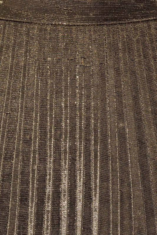 Step into the spotlight with our Lurex Fabric Pleated Midi Skirt. Crafted from a shimmering lurex fabric, this skirt catches the light beautifully, making it perfect for special occasions and festive events. The pleated design adds an elegant and sophisticated touch, creating graceful movement with every step you take. The midi length offers a versatile look that can be dressed up or down, making it a versatile addition to your wardrobe.